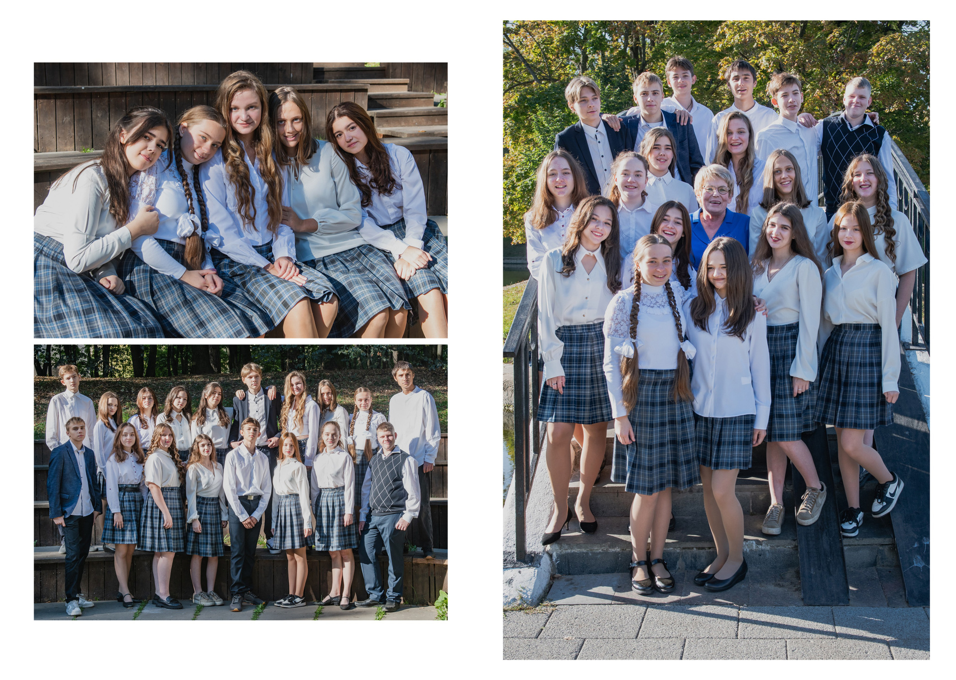 2-3 одинаковых для всех разворота с групповыми фото детей всего класса.